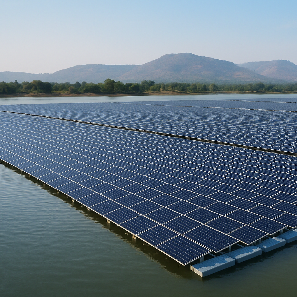 A floating solar power plant, also known as floatovoltaics, is a solar power generation system where photovoltaic (PV) panels are installed on floating structures over water bodies such as lakes, reservoirs, or the sea, enabling efficient energy generation without using land.